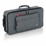 軽いアルミレール使用したペダルボードです。前方にゴム足を配して傾斜を付け、高さが調節できます。ボード上面にはあらかじめベルクロが張られていてすぐにレイアウトが可能です。底裏面にはACアダプターを配置できゴムバンドで固定する構造です。ボードはポケットつきのソフトケースに収められます。