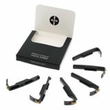 通常のカポタストはフレット側のアール形状が固定されている為、ギターの種類やメーカーによっては完全に性能を発揮出来ない場合が有りましたが、タリアカポには、「0"for Classicals, 7.25”, 9.5”, 10”, 12”, 15”, 16"」の7種類のフレットパッド・キットが付属しており、使用するギターに合わせてカスタマイズする事が可能です。