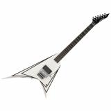 Limited Edition Jackson X Series King V KVXは、ポプラ材のボディ、スルーネック構造の3ピースメイプルネック、バインディング付き12〜16インチコンパウンドラジアスのローズウッド指板を備えています。コンパウンドラジアス指板は、ナット付近では丸みを帯びコードが押さえやすく、ハイポジションに近づくにつれて平らな形状に変化するため、弦落ちを気にせず大胆なベンディングが可能です。