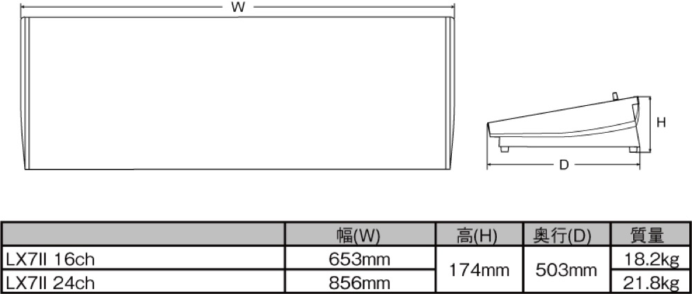 寸法(幅×高×奥行)、質量 856×174×503mm、21.8kg
