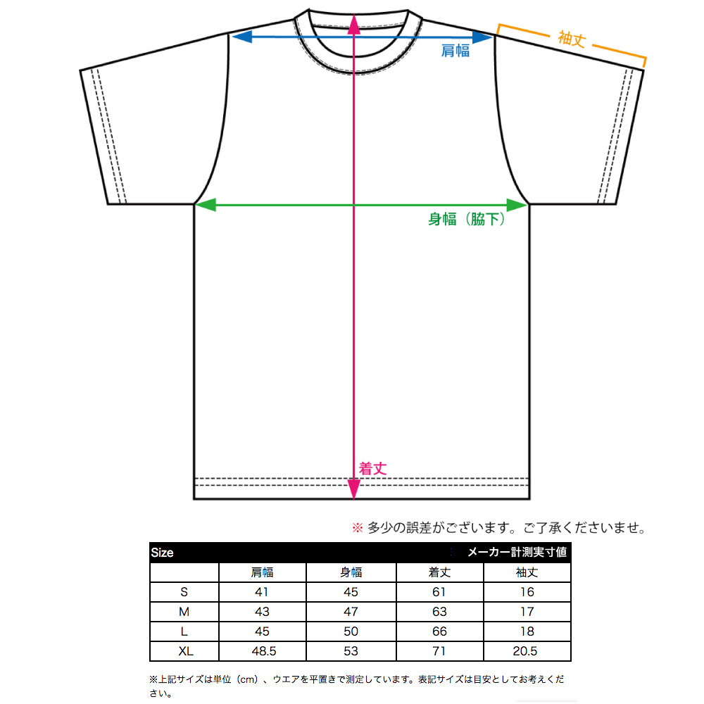 S、M、L、XLの4サイズあります。ただ、全体的に小さめのサイズで作っていますので、バンドTやアメリカなどのサイズ感覚だと小さく感じるかもしれません。