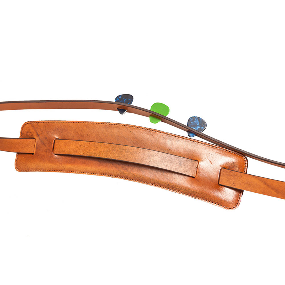 SLIMは60年代を彷彿とさせるクラシックなデザインのストラップです。高品質のレザーを使用しておりますので引き締まった光沢を持ち存在感があります。肩のパッドは外側をレザー、内側はマイクロファイバーを使用、衣服の擦れを防ぎます。30cm×7cmサイズのパッドは5mm厚のラテックスを使用しており肩の負担を軽減させます。カラーは職人による染色が行われますので時期によって異なる場合がございますが、個性としてお楽しみください。124cm~151cmをバックルで調整可能。スリット状のピックホルダーも搭載しています。