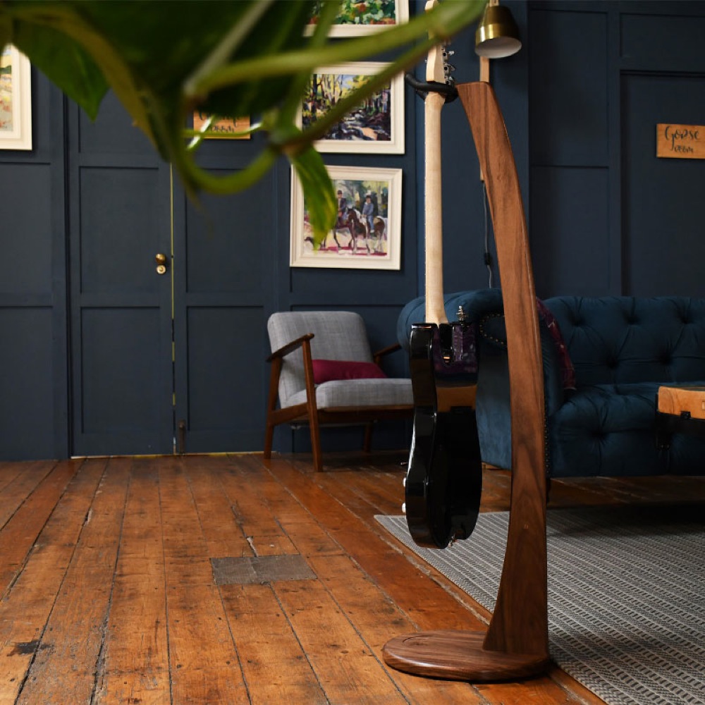 Ruach Musicの木製ギタースタンドには、楽器本体にも使用されるウォルナットやアッシュなどの高級な木材が使用されています。インテリアと調和するシンプルなデザインと、幅広い用途に合わせた機能性が特長です。