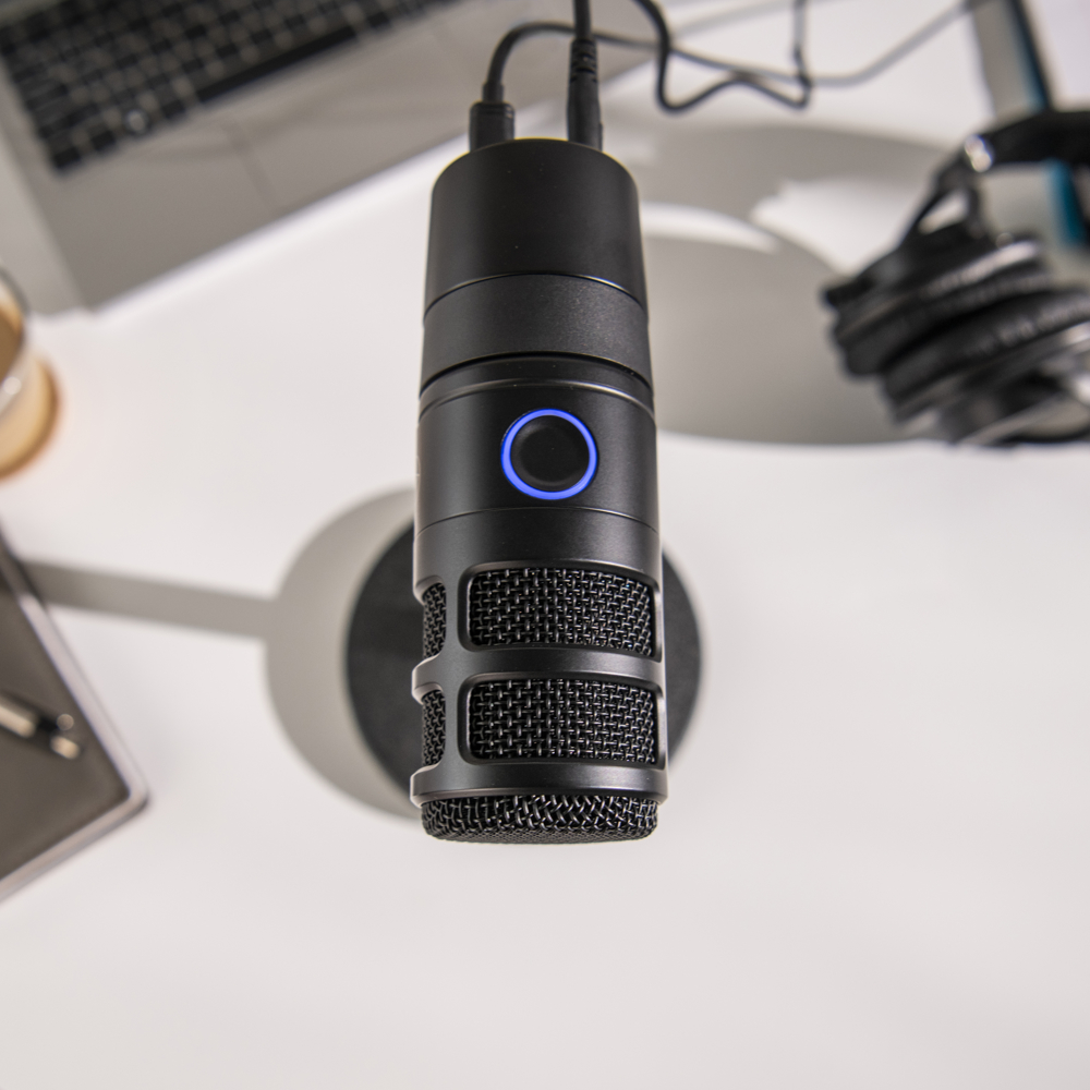 マイクで収音した音と PC 音源のバランスを調整できる、ミキサー調整 ダイヤルを搭載。接続したヘッドホンのボリューム調整も可能です。