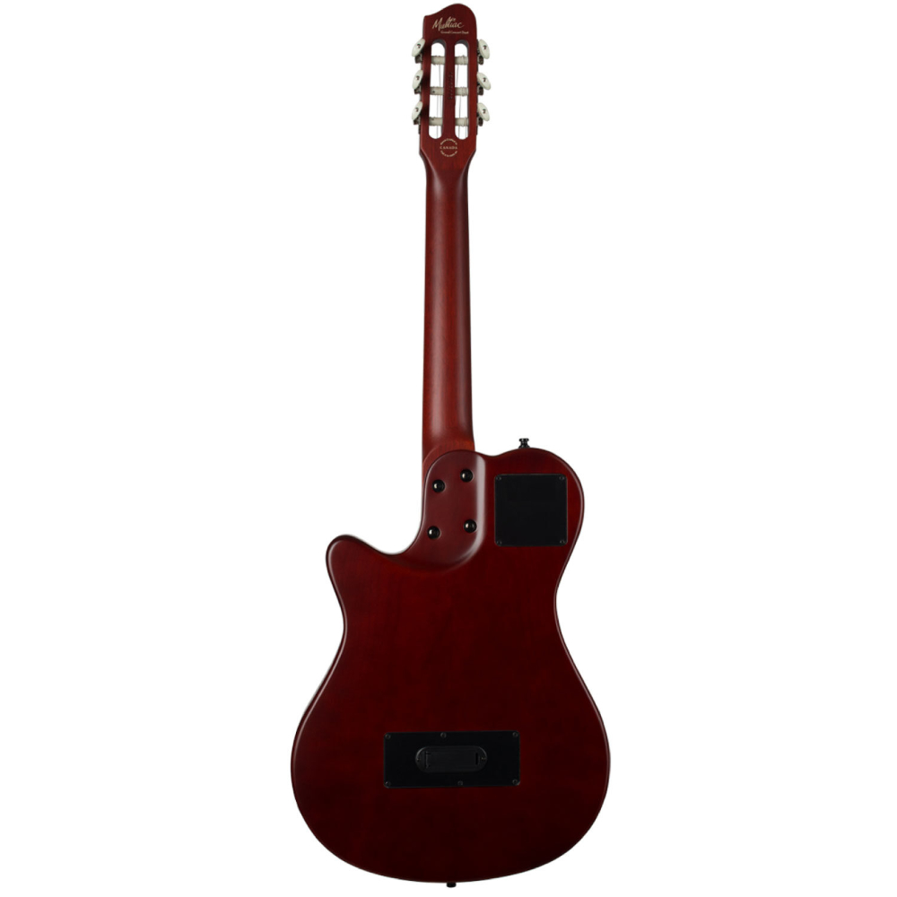 Multiac Grand Concert Encore Natural SGは、2" (50.8 mm)のナット幅、12フレットジョイントによりナイロンギタープレイヤーが違和感なく演奏できる設計シンプルな操作性のGodin Double Source Customプリアンプを搭載したモデルです。サウンドホールを廃しコントロール部に設けられた空気孔のみのダブルチェンバーボディー構造のダブルチェンバードシルバーリーフメイプル/バスウッドウイングは、ハウリングのリスクを最小限に抑えます。ソリッドシダートップとマホガニー・ネックとの組み合わせはプラグドでもリアルなナイロンギターサウンドを奏でますGodin Double Source Customプリアンプはアンダーサドル・ピックアップとギター内のセンサーをミックス可能で、高い汎用性とプラグドでも自然なナイロンサウンドを実現。ボリューム、トレブル、ミッド、ベース、ブレンドコントロールを備え高い汎用性と多彩なサウンドメイクを可能にしています。