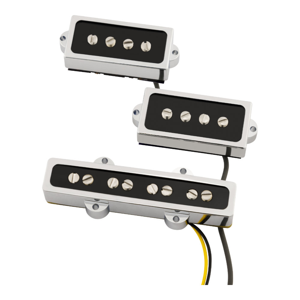 Cobalt Chromeマグネットはサウンドにパンチとハイファイな明瞭さとダイナミックレンジを加えます。本製品はスプリットコイルのPrecision BassミドルピックアップとJazz Bassブリッジピックアップがセットになっており、幅広いトーンが得られます。特徴的な外観のクロムリングカバーは、60サイクルのハムノイズを除去するシールドとして機能し、驚異的な静かさを誇ります。