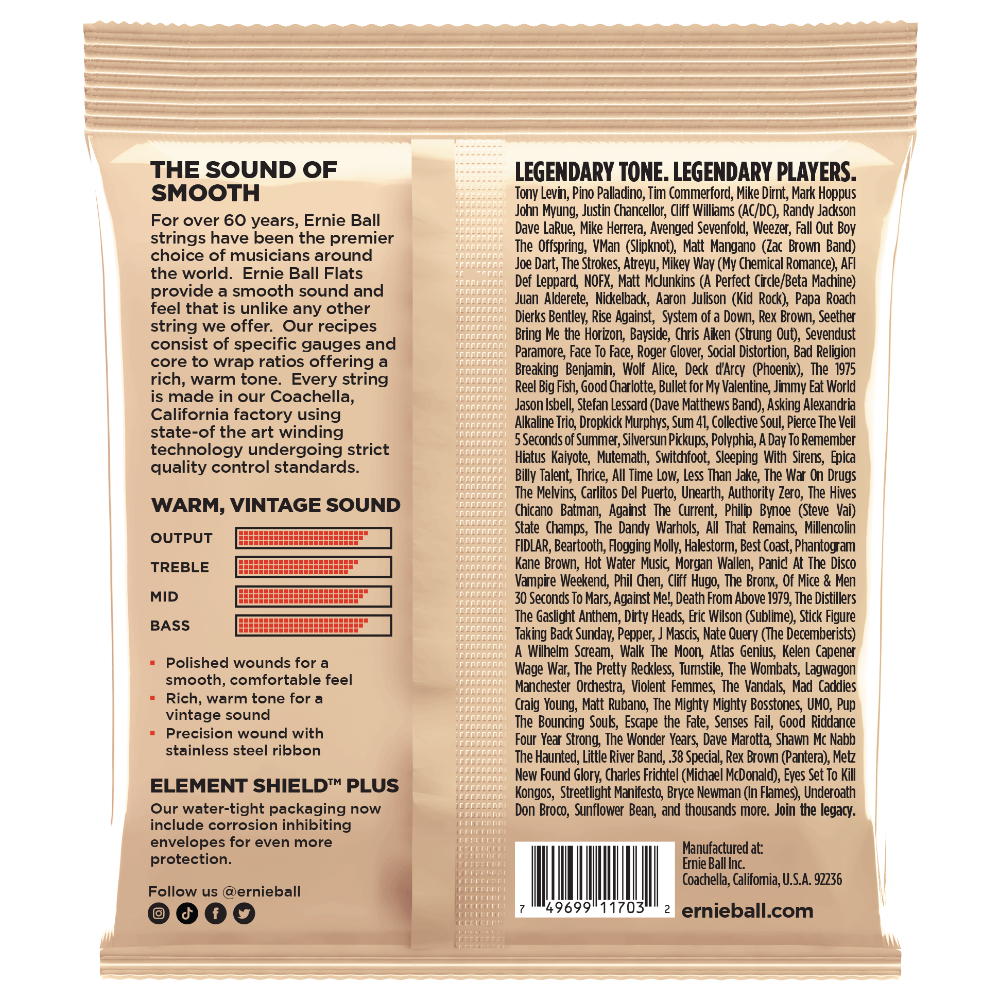 アーニーボールのフラットワウンドエレクトリックベース弦は、六角形の錫メッキスチールコアの周りに巻かれた平らなステンレススチールワイヤーを使用しています。