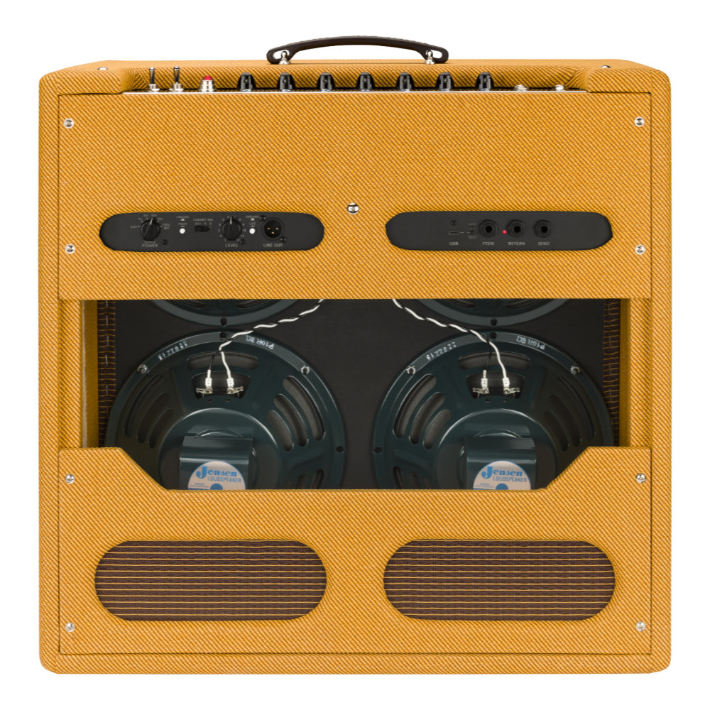 4基のJensen P-10Rスピーカーはサウンドのきらめきとタッチセンシティブな特徴に加え、コンボリューションスプリングリバーブ、スムーズなベースレスポンスを提供するVintage/Tight切替スイッチ、エフェクトループなど、プレイヤー目線の追加機能を内蔵しています。その他、フルパワーと5段階のアッテネート設定が切り替え可能な出力パワーセレクター、精緻なキャビネットシミュレーションを実現するインパルスレスポンス(IR)XLRライン出力、ミュートスイッチ、軽量なパイン材キャビネットなどの特徴を備えています。