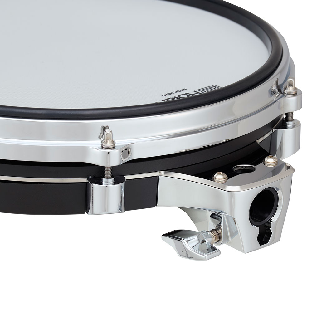 12インチのV-Pad PD-12Xは、V-Drumsのフラッグシップ・モデルTD716のタムとして標準搭載されており、その他の一部V-Drumsでも使うことができます。流線型のデザインは、アコースティック・ドラムに近いフープの高さを実現し、浅胴シェルゆえにより効率的なセットアップが可能になります。高解像度のマルチ・センサー・システムは、リム/ヘッドの個別検出やホット・スポットの改善、音源モジュールV71をはじめとしたV-Drums音源モジュールによる打点位置検出を可能にしています。また新しいマウント機構により、主要なハードウェア・ブランドに対応することができます。