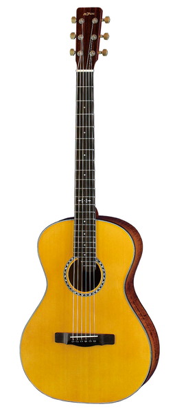 スプルース単板トップにメイプル単板のバック&サイド、導管を埋め、表面がフラットな艶消し仕上げ(クローズド・ポア・フィニッシュ)、天然木の素材感をそのまま引き出す透明ピックガードを採用。