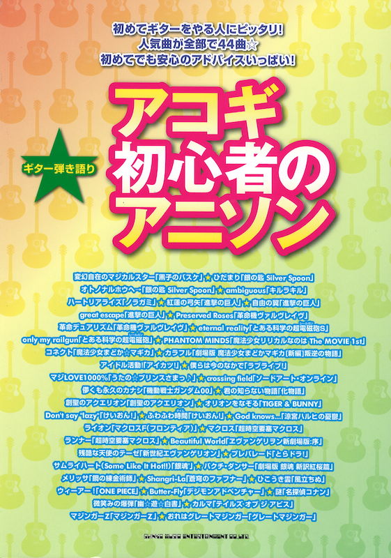 初めてアコギで弾き語りをしたいみんなにピッタリのシリーズに、アニソンを詰め込んだ一冊が登場★ 「進撃の巨人」や「マクロス」「~とあるシリーズ」などの人気曲から、「銀の匙 Silver Spoon」「キルラキル」「黒子のバスケ」など最新楽曲まで、弾き語りをやるならまず挑戦したい曲を全部で44曲も掲載。購入しやすいお得な価格、さらに沢山のアドバイス入りで初めてでも安心です!