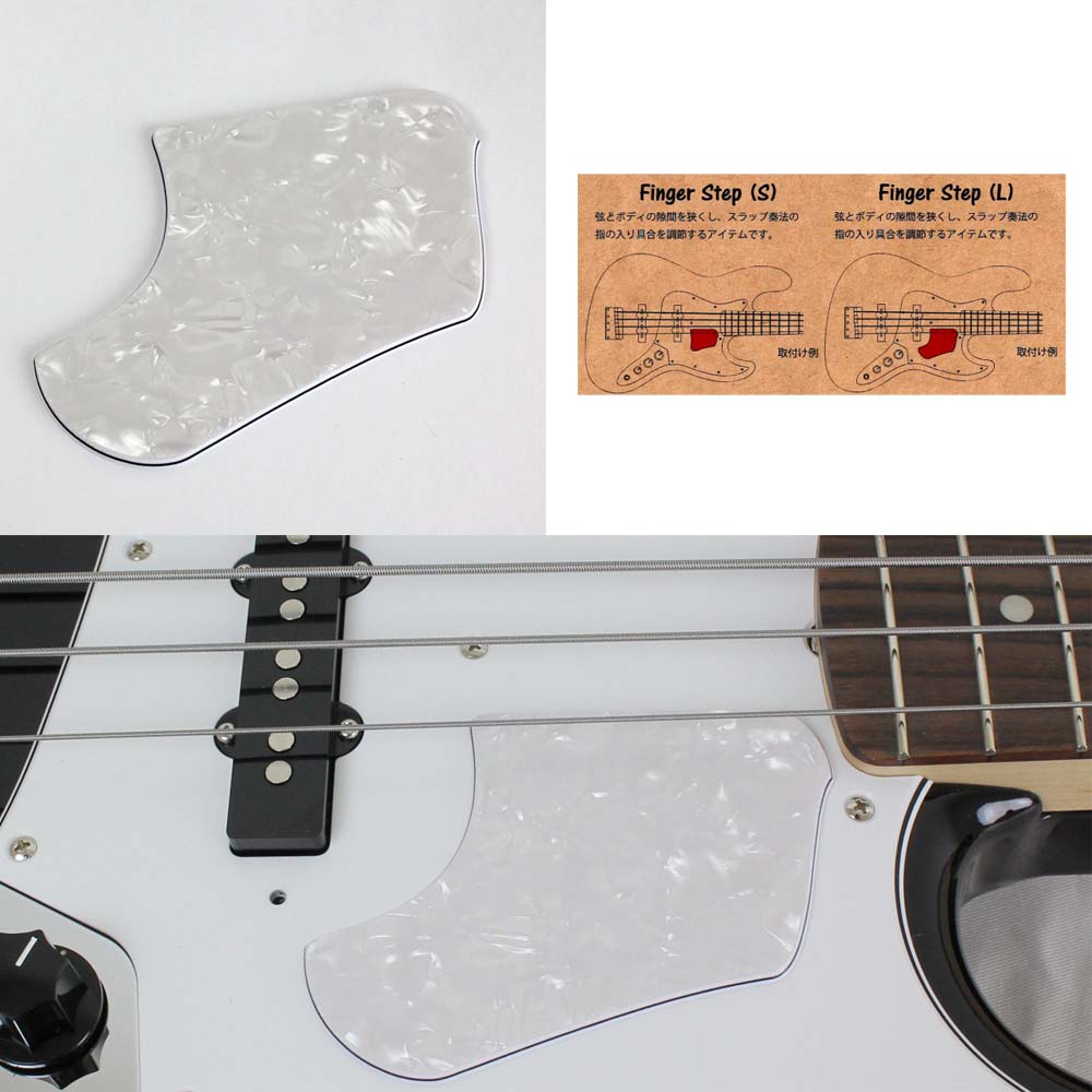 「Finger Step」はピックガードと同素材でできており、両面テープ(別売)で弦とボディの間に固定することにより、一段隙間が埋まります。それによってプル(人差し指で弦を弾く奏法)がし易くなり早いパッセージにも対応できるようになります。